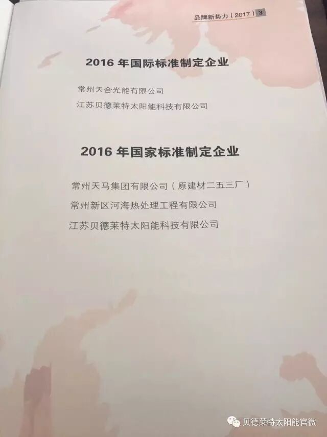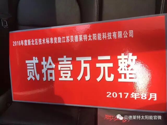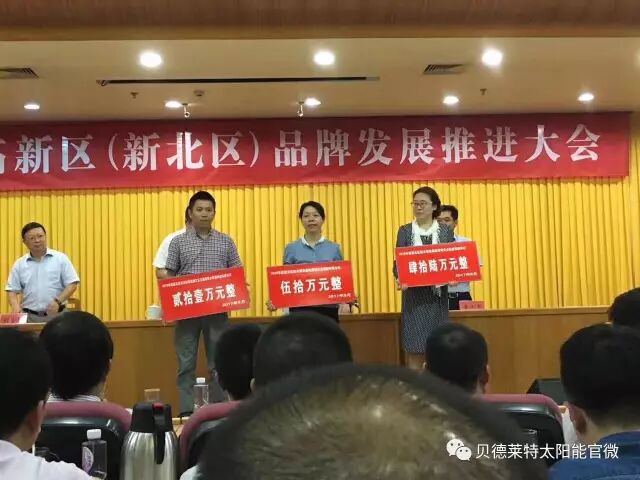 8.18常州新北区政府召开品牌推广表彰会,对区内企业在品牌推广方面做优异成绩的企业进行表彰。“江苏贝德莱特太阳能科技有限公司”因参与二项国际标准制订和二项国家标准制订,成绩突出,收到表彰并且物质奖励21万元。